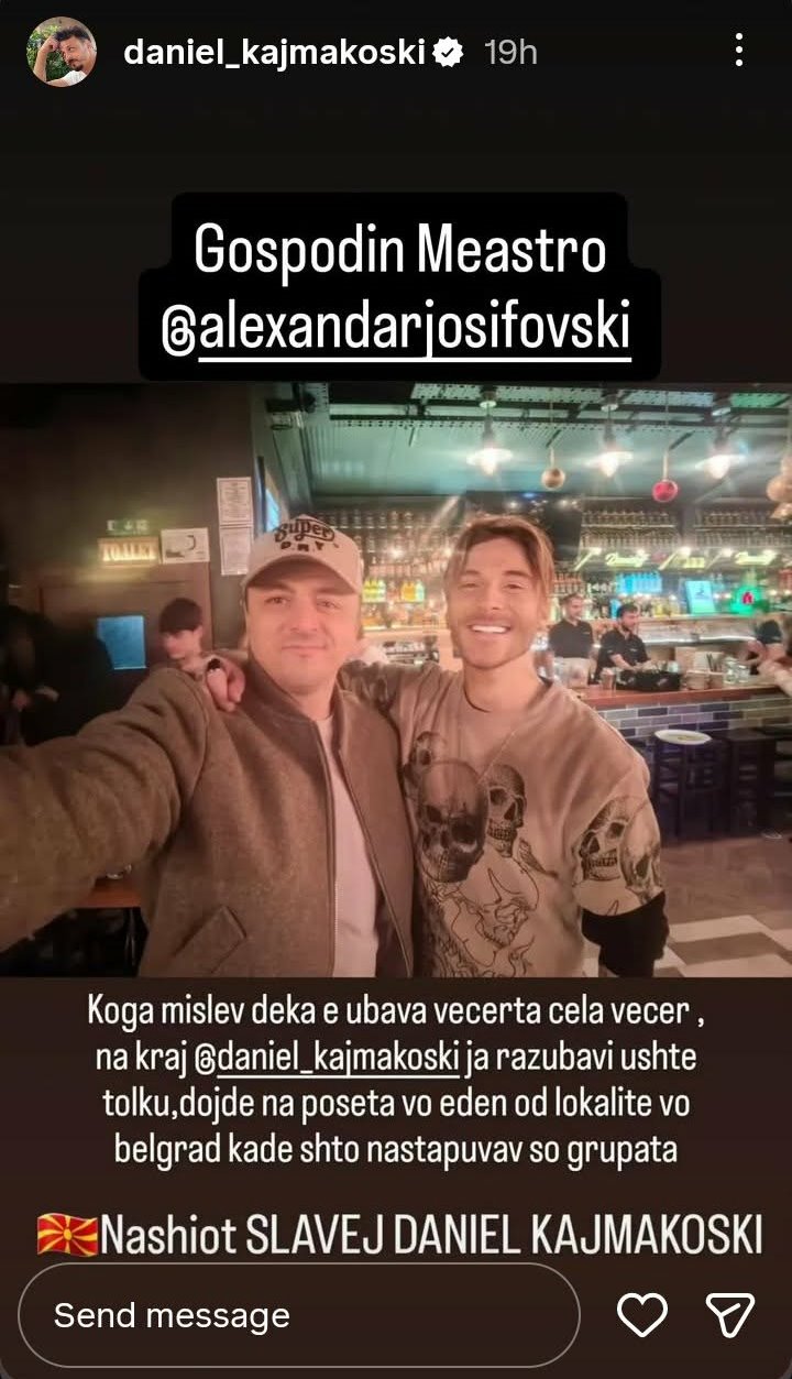 -Кога мислев дека е убава вечерта, цела вечер, на крај Даниел Кајмакоски ја разубави уште толку, дојде на посета во еден од локалите во Белград каде што настапував со грушата. Нашиот слајвеј, Даниел кајмакоски- напиша Александар во описот на заедничката фотографија со својот колега.