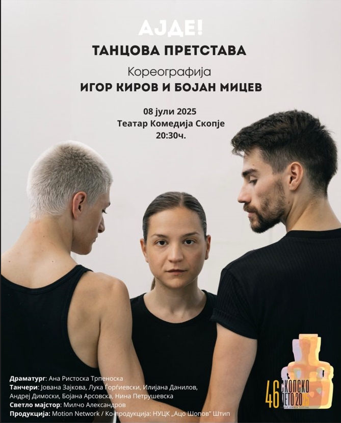 Во вторник, на 8 јули во Театар Комедија во 20,30 часот ќе биде изведена танцовата претстава „Ајде“ чии кореографи се Игор Киров и Бојан Мицев. Драматург е Ана Ристоска Трпеноска. Настапуваат танчерите: Јована Зајкова, Лука Ѓорѓиевски, Илијана Данилов, Нина Петрушевска, Андреј Димоски и Бојана Арсовска.