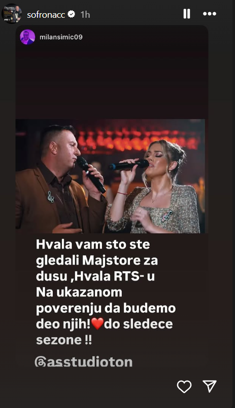 – Се ближи последната епизода од „Мајстори за душу“од оваа серија. Сега кога ќе се свртам, гледам толку многу прекрасни колеги, големи музички ѕвезди, кои мајсторски ги отпеале заборавените бисери на народната музика. Гледам долг список на пишани ноти и аранжмани како богатство на музичкоto наследство. Мојата мисија успеа – повторно да свирам и да ги вратам заборавените вредности и да им дадам нов сјај – изјави Александар Софронијевиќ за Гранд, додавајќи дека е неизмерно горд на својот тим.