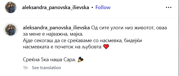 „Од сите улоги низ животот, оваа за мене е најважна – мајка. Ајде секогаш да се среќаваме со насмевка, бидејќи насмевката е почеток на љубовта. Среќна 5-ка, наша Сара!“, напиша водителката која е секогаш насмеана, а чија порака веднаш предизвика внимание од јавноста.