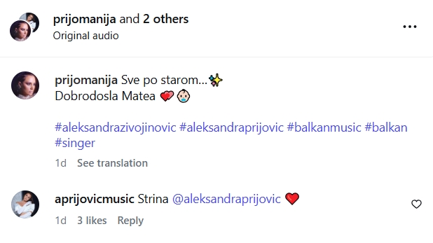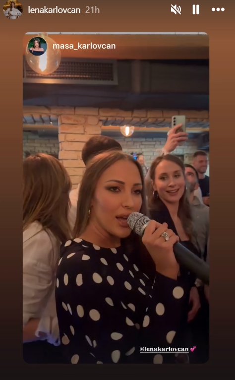Атмосферата ја загреа Александра Пријовиќ, која го зеде микрофонот и ги пееше своите најголеми хитови еден по друг, додека сите гости пееја заедно со неа. Колку се блиски, покажува и фактот што новопечената мајка Лена сподели дел од атмосферата на својот профил, објавувајќи видео од Прија како пее. Таа остави краток, но емотивен опис со видеото: „Стрина“, и директно ја тагна Александра Пријовиќ.