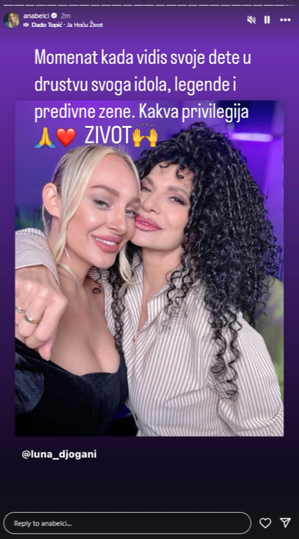 – Моментот кога ќе го видите вашето дете во друштво на вашиот идол, легенда и убава жена. Каква привилегија! – напиша Анабела.