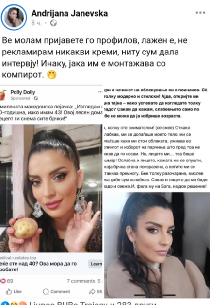 „Ве молам пријавете го профилов, лажен е, не рекламирам никакви креми, ниту сум дала интервју! Инаку, јака им е монтажава со компирот“. напиша Јаневска во објавата.