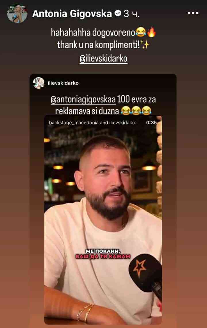 По објавените видеа, следеше и реакција од Дарко кој и посочи на Гиговска дека за вакви комплименти му е должна сто евра, а таа без проблем прифати дека е должничка и се согласи со вака ниската цена.
