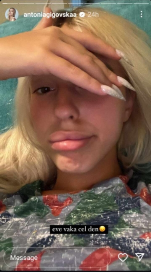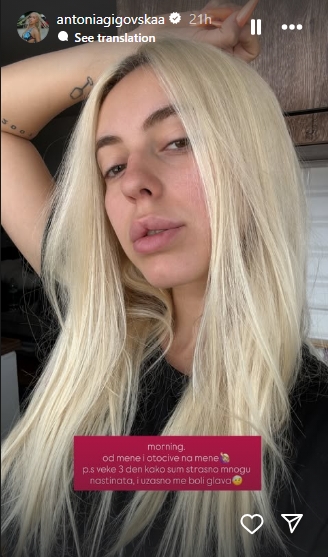 -Добро утро од мене и отоциве. П.с веќе три дека како сум страшно многу настината и ужасно ме боли глава. Пишува Гиговска во последната објава каде им посака добро утро на своите следбеници покажувајќи дека денот не е почнат со убаво, а така е веќе три дена наназад.