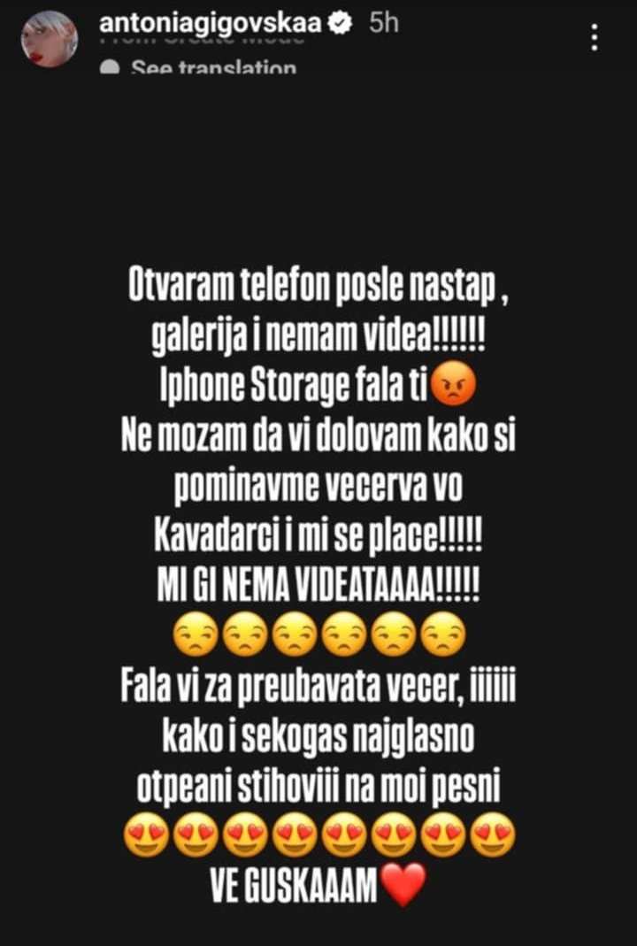 -Отварам телефон после настап, галерија и немам видеа!!!Iphone storage фала ти (лут емотикон). Не можам да ви доловам како си поминавме вечерва во Кавадарци и ми се плаче! Ми ги нема видеата! Фала ви за преубавата вечер и како и секогаш најгласно отпеани стихови на мои песни. Ве гушкам- и порача Антониа на својата публика.