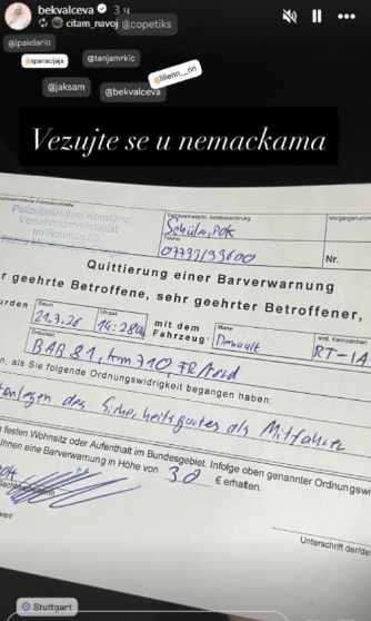 Според правилата во Германија, казната е наплатена на лице место во износ од 30 евра, што е потврдено со сметката што Беквалац ја споделила со своите следбеници.