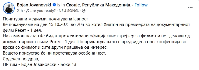 И додека Боки 13-ка ги кани медиумите и јавноста оваа среда (15.10.2025 г.) на премиера на својота верзија од животната приказна филмувана во документарниот филм Рекет – 1 дел, во режија на Весна Бејби Петрушевска, судот „го поздрави“ со пресуда во која е содржана нова 5-ка, во вид на затворска казна. Ќе има ли од неа документарец и дали новопечениот поткастер ќе мора да се врати назад зад решетки за затворската казна да ја одлежи, останува да видиме?!