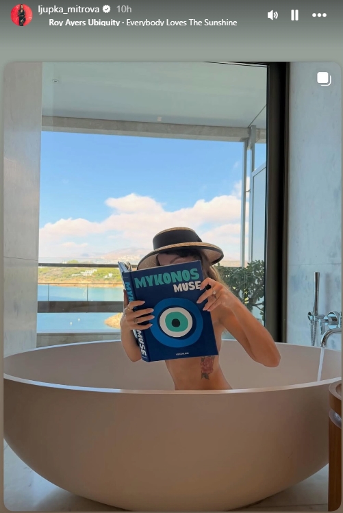 Така и овој пат тазе венчаната невеста покажа дека покрај се друго, еротиката и е посилна стрална… Особено онаа – уметничката. Седната на хотелскиот тросед со широко раширени нозе, боса и доволно гола ја буди фантазијата, предизвикувајќи нов хормонски потрес, зашто зад отворената книга со музите на Миконос, Љупка е повторно топлес!