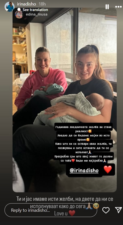 – Годинава заедничката желба ни стана реалност. Заедно да си бидеме мајки во исто време. Како што ни се оствари оваа желба, ти посакувам и сите останати да ти се исполнат. Пресреќна сум што овој живот го делам со тебе. Биди ми најсреќна, пишуваше во пораката. За убавите зборови што и ги напиша Ирина веднаш и возврати: