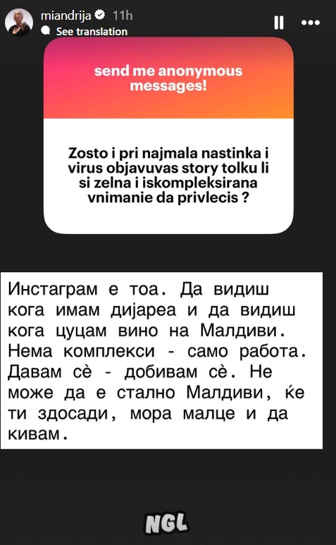 Инстаграм е тоа. Да видиш кога имам ди*ареа и да видиш кога ц*цам вино на Малдиви. Нема комплекси само работа. Давам сѐ добивам сѐ. Не може да е стално Малдиви, ќе ти здосади, мора малце и да кивам – му откри таа како стојат работите во инфлуенсерството.