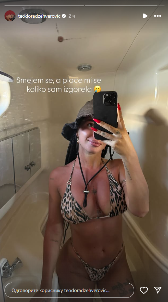 „Се смеам, но ми се плаче поради тоа колку сум изгорена од сонце“, напиша Теодора на Инстаграм.