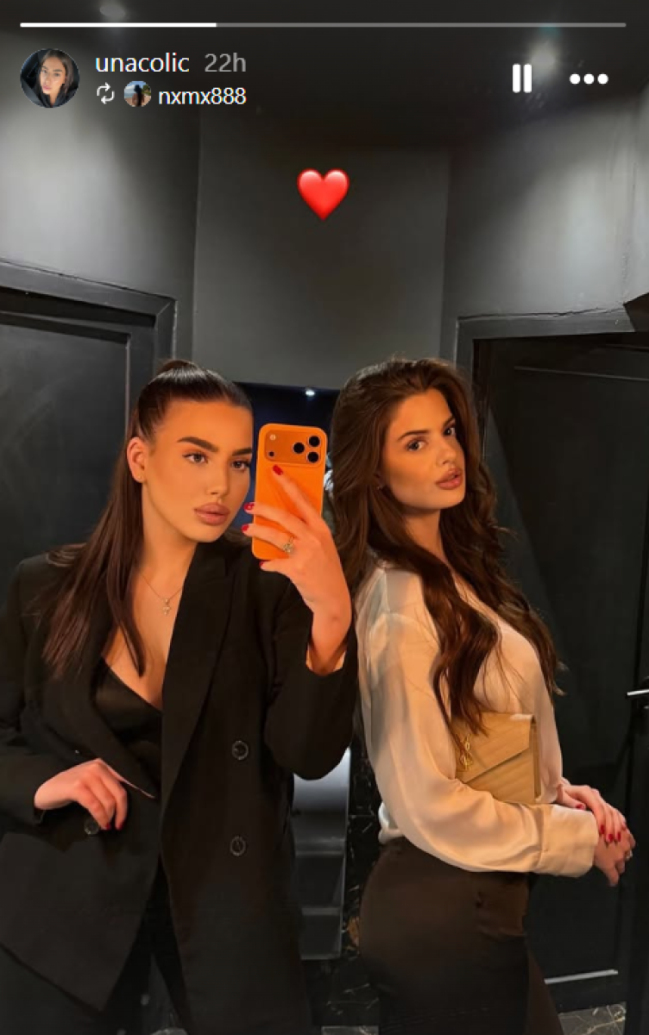 Уна се фотографираше во тоалетот, каде што позираше во црна облека со длабоко деколте, нагласувајќи го својот атрактивен изглед. Во добро расположение, не беше сама – друштво ѝ правеа нејзините пријатели, со кои направи селфи заедно.