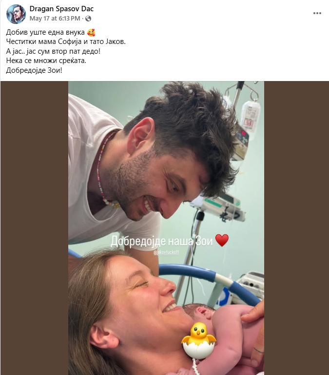 „Добив уште една внука. Честитки мама Софија и тато Јаков. А јас… јас сум втор пат дедо! Нека се множи среќата. Добредојде Зои!“, напиша тој под фотографијата.