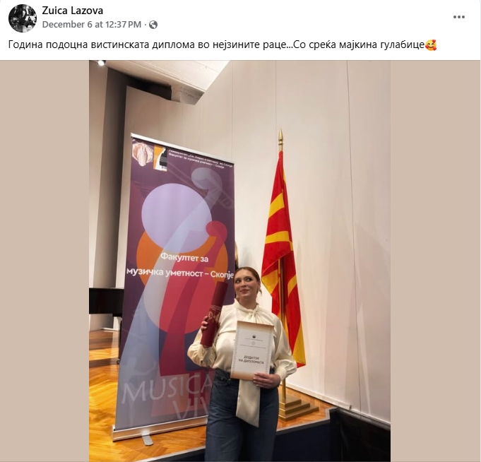 Имено, нивната ќерка Македонка дипломираше соло пеење на Факултетот за музичка уметност во Скопје, а семејството беше присутно како и на завршниот концерт претходно, така и на доделувањето на дипломата.