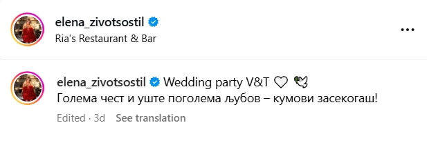Фотографиите од свеченоста ги сподели на Инстаграм со зборовите: „Wedding party V & T. Голема чест и уште поголема љубов – кумови засекогаш!“