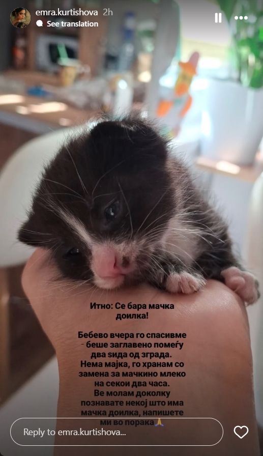 – Итно: Се бара мачка доилка! Бебето вчера го спасивме беше заглавено помегу два ѕида од зграда. Нема мајка го хранам со замена за мачкино млеко на секои дава часа. Ве молам доколку познавате некој што има мачка доилка, напишете ми во порака – гласеше нејзината молба до Инстаграм пријателите, кои веројатно веднаш ја забележале нејзината најнова објава на приказната.