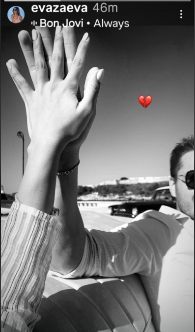 На стори фотографијата во позадина тече песната „Always“ од Џон Бон Џови во која се пее: „And I’ll love you, always…“ (И ќе те сакам засекогаш), а преку неа Ева споделила и емотикон со скршено срце.