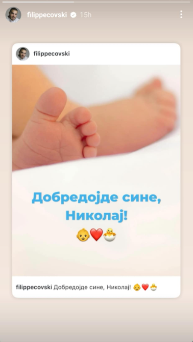 Добредојде сине, Николај! – напиша пејачот на социјалната мрежа и со радост го сподели и на кратките приказни за поголем број следбеници да ја видат прекрасната вест.