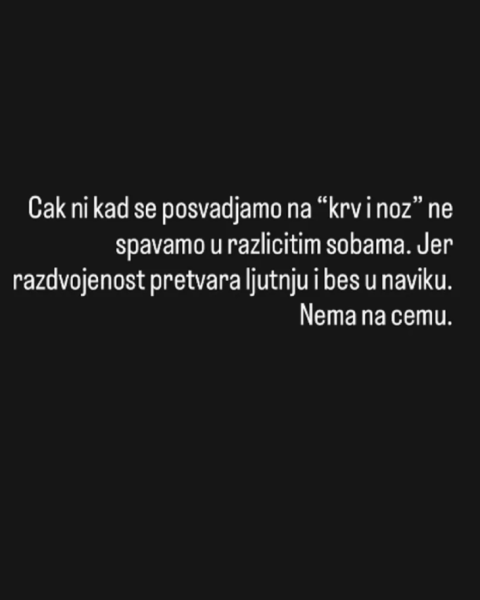 „Дури и кога се караме до степен на „крв и нож“, не спиеме во различни соби бидејќи разделбата се претвора во гнев, бес и навика. Нема на што“, напиша таа на својот Инстаграм профил.