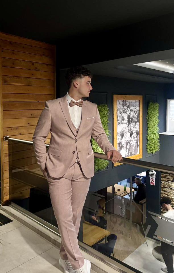 За матурската вечер, Јован беше дотеран во елегантен трендовски машки костум во нежна пастелна нијанса и бела кошула со пеперутка-вратоврска. Изгледот го надополни во младешки стил, со бели патики.