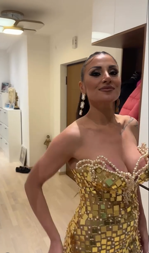 Ако таму буквално ги „запали“ со црвениот проѕирен фустан што изгледаше како извлечено од модно списание, па присутните не можеа да го тргнат погледот од неа, додека за Нова Година пееше дома во златно провидна комбинација во која разголените гради домионираа, сега Гавазова отиде чекор понатаму.