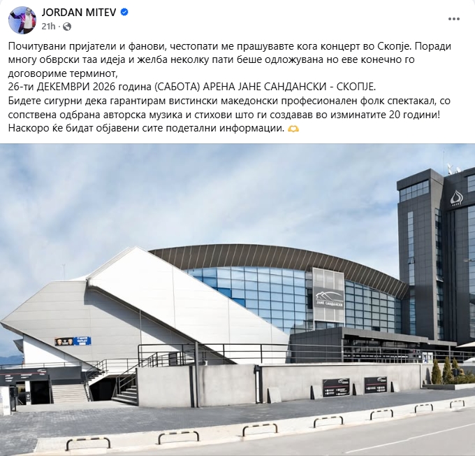 Македонската фолк сцена добива најава што веќе предизвикува голем интерес – популарниот пејач Јордан Митев официјално потврди дека кон крајот на 2026 година ќе одржи голем солистички концерт во Скопје.