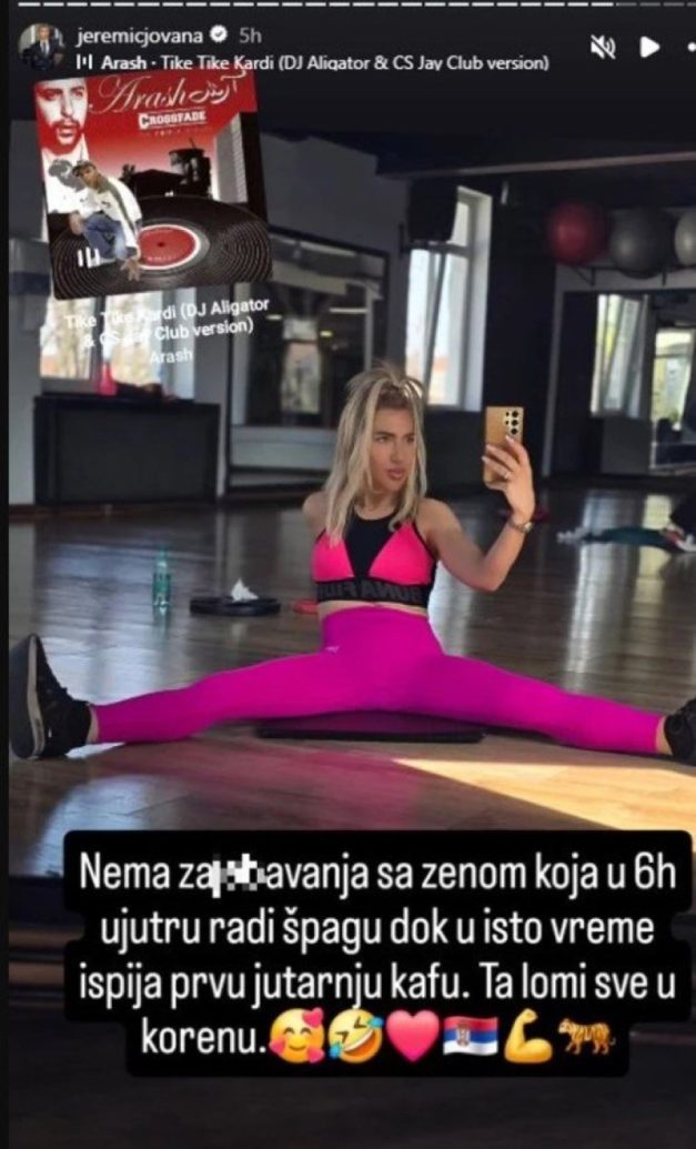 Водителката Јована Јеремиќ многу се грижи за својата фигура и редовно се огласува со фотографии од теретана, па сега позираше во розови хеланки и топ.