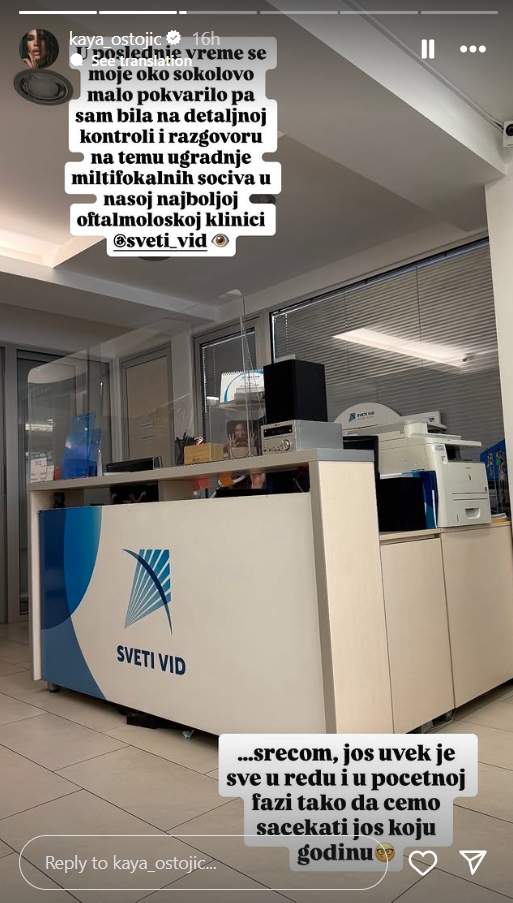 „Во последно време, моето јастребово око е малку лошо, па имав детален преглед и дискусија за поставување мултифокални леќи во офталмолошка клиника“, напиша Каја на својот Инстаграм профил.