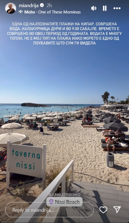 На една од фотографиите, таа позира во костим за капење заедно со Тијана, и двете со широка насмевка покажуваат колку уживаат во пријатната клима и убавините на Кипар.