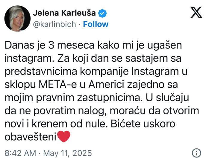 Пејачката Јелена Карлеуша објави дека наскоро ќе се сретне со претставници на компанијата META, која е и сопственик на социјалната мрежа „Instagram“, со цел да се обиде да го врати својот деактивиран профил. Како што музичката ѕвезда истакна на социјалната мрежа „X“, порано „Twitter“, таа ќе отпатува во Америка со својот правен тим, со цел официјално да разговара со претставниците на компанијата за проблемот што ја снајде пред три месеци.