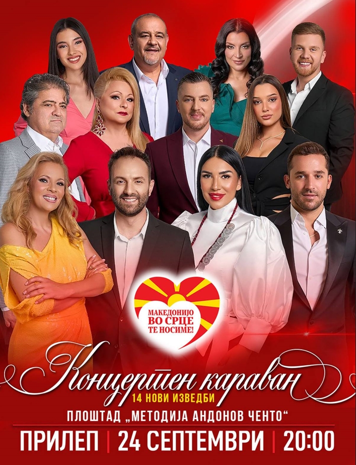 Градовите ширум Македонија веќе одекнаа со звуци на љубов, традиција и гордост. Илјадници луѓе се собраа под отворено небо, со едно срце и една песна – за Македонија. На концертот во Битола, платото пред Офицерскиот дом беше претесно за сите што сакаа да ја почувствуваат магијата на 14-те нови композиции – химни на љубовта кон татковината. Во Гостивар, емоциите кулминираа со силна порака: Македонската песна живее! Сега, таа иста енергија и топлина во среда на 24 септември пристигнува и во Прилеп. Концертот кога на плоштадот „Методија Андонов – Ченто“ на сцената ќе блеснат: Бојана Скендеровски, Наум Петрески, Зуица Лазова, Ламбе Алабаковски, Спасен Силјаноски, Андријана Јаневска, Сузана Спасовска, Александар Тарабунов, Огнен Здравковски, Миле Кузмановски, Марија Спасовска и Мина Блажев е со почеток во 20:00 часот.