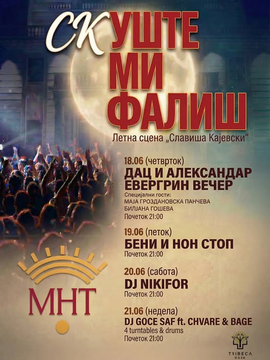 Летната сцена „Славиша Кајевски“ по трет пат ќе биде отворена на 18 јуни со концерт на Дац и Александар. На 19 јуни ќе настапи Бени Нон Стоп, на 20 јуни DJ Nikifor, а на 21 јуни програмата ќе биде затворена со настап на DJ Goce ft. Chvare & Bage (4 turntables & drums).