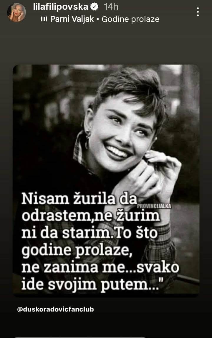 -Не брзав да пораснам, не брзам ниту да остарам. Тоа што годините минуваат, не ме интересира… секој оди по својот пат… стои во објавата од „стори“ приказните на Лила.