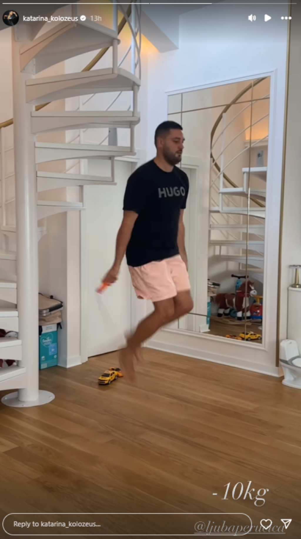 Така, сопругата на пејачот, Катарина Колозеус, која се породи во средината на мај, го сними пејачот како тренира.