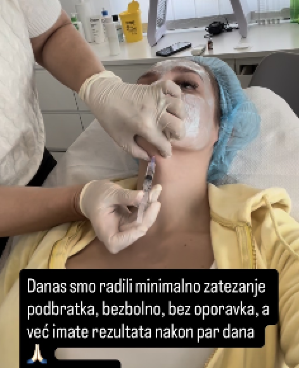 – Денес направивме минимално подигнување на двојната брада, безболно, без закрепнување, а по неколку дена веќе ги имате резултатите – напиша таа под фотографиите што ги сподели на Инстаграм.