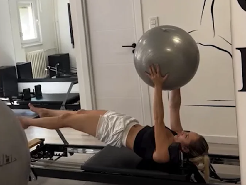 Луѓето можеа да видат како Ѓогани ги совладала техниките на пилатес на реформер додека држеше голема топка за вежбање во рацете.