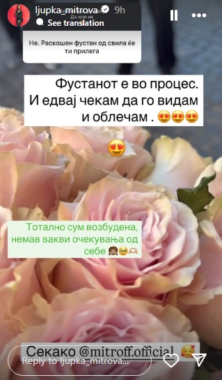 Напомена и дека помислила да облече кожна венчаница, а некои и сугерираа дека раскошен фустан од свила ќе и прилега најмногу. Љупка, се дополни и дека фустанот е во процес, па едвај чека да го види и облече.