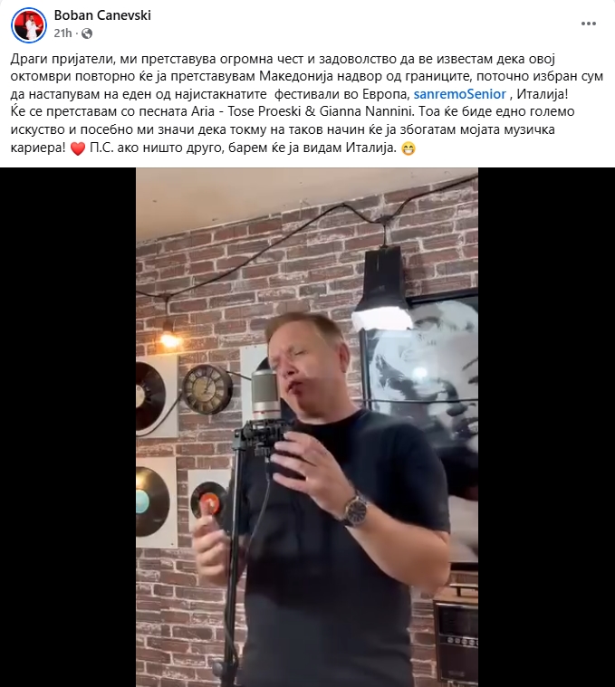 „Драги пријатели, ми претставува огромна чест и задоволство да ве известам дека овој октомври повторно ќе ја претставувам Македонија надвор од границите, поточно избран сум да настапувам на еден од најистакнатите фестивали во Европа, sanremoSenior , Италија!