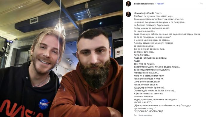 Тогаш Јосифовски на своите профили на социјалните мрежи објави заедничка фотографија со обемен трогателен пост, во кој со огромна тага и мака јавно се прости од својот другар.