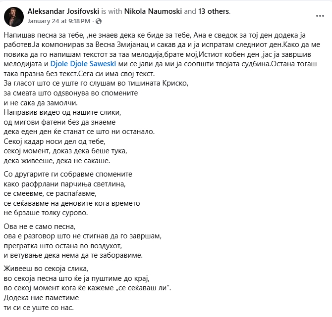 Деновиве охридскиот рокер одново сподели нова содржина, овој пат само на својот Фејсбук профил, на кој всушност Јосифовски објави песна за својот трагично починат другар Криско, како што му беше прекарот на Љушев.
