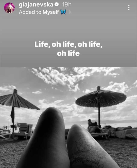 Денес тој е сосема друга личност. Русокосата Џиа која ја тера 34-ката, летово го слави животот во родната Македонија… Онака како што отсекогаш посакувала, а сега тоа може и да си го дозволи неоптоварена од туѓите предрасуди, непријатни муабети, тешки осуди! Со последните објави на својот Инстаграм профил откри дека деновиве е на одмор во Охрид.