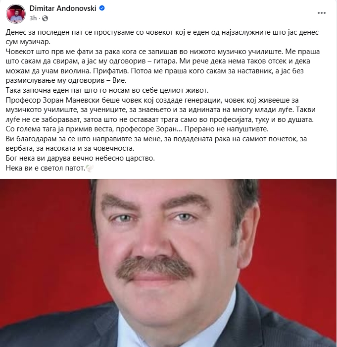 Погоден од прераното заминување на Зоран Маневски, македонскиот пејач со трогателен Фејсбук статус, се прости од својот починат професор, јавно заблагодарувајќи му се за се’ што направил за него во животот.