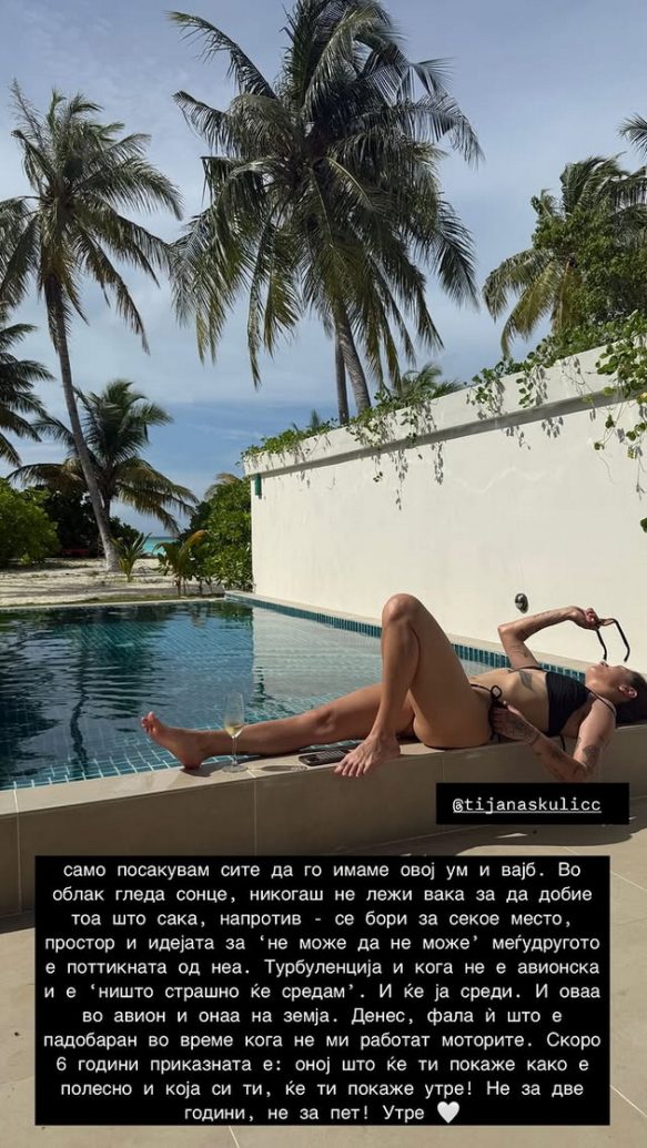 Токму затоа на последното од нивните егзотични патувања, Миа Костова онака распослана меѓу две палми на една песочна плажа на Малдиви, начека згодна прилика на својата „верна сенка“ да и се заблагодари со пишани зборови и таа благодарност јавно да ја објави на своите Инстаграм приказни.