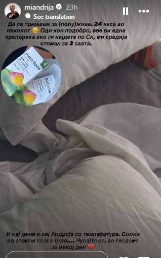 -Да се пријавам за (полу)жива. 24 часа во пеколот. Оди кон подобро, еве ви една препорака ако ги најдете по Ск, ми средија стомак за 3 саата. И кај мене и кај Андрија со температура. Болки во стомак, глава, тело … Чувајте се, се гледаме за некој ден, стои во објавата.