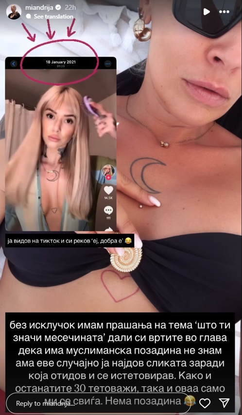 „Без исклучок имам прашања на тема – што ти значи месечината, дали си вртите во глава дека има муслиманска позадина не знам, ама еве случајно ја најдов сликата заради која отидов и се истетовирав. Како и останатите 30 тетоважи, така и оваа само ми се свиѓа. Нема позадина“ – споделила инфлуенсерката појаснувајќи ја намерата зошто си истетовирала полумесечина над градите.