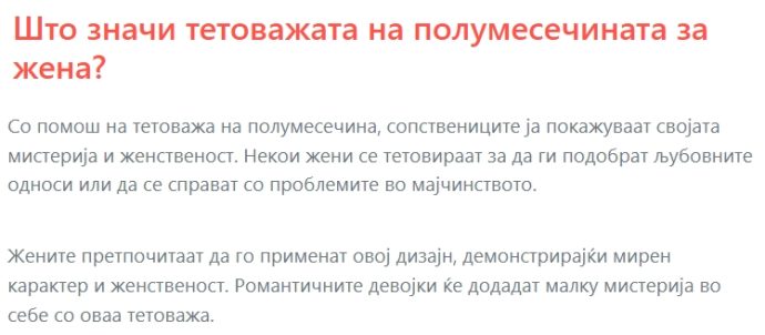 Жените претпочитаат да го применат овој дизајн, демонстрирајќи мирен карактер и женственост. Романтичните девојки ќе додадат малку мистерија во себе со оваа тетоважа. Вака вели толкувањето на значењата на тетовираната полумесечина, ама еве што за изборот на својата тетоважа вели самата Миа Костова: