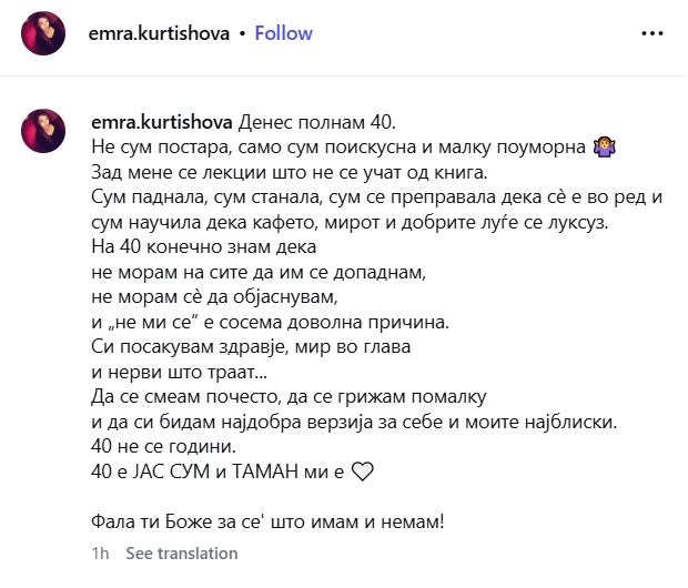 Сум паднала, сум станала, сум се преправала дека сè е во ред и сум научила дека кафето, мирот и добрите луѓе се луксуз. На 40 конечно знам дека не морам на сите да им се допаднам, не морам сè да објаснувам, и „не ми се“ е сосема доволна причина. Си посакувам здравје, мир во глава и нерви што траат… Да се смеам почесто, да се грижам помалку и да си бидам најдобра верзија за себе и моите најблиски. 40 не се години. 40 е јас сум и таман ми е. Фала ти Боже за се’ што имам и немам! – напиша Емра покрај фотографијата од себе.