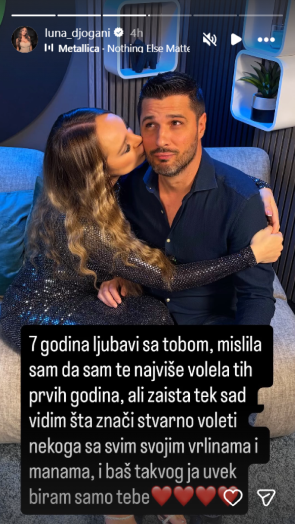 „Седум години љубов со тебе. Мислев дека те сакам најмногу во тие први години, но дури сега гледам што значи навистина да сакаш некого со сите негови доблести и недостатоци. И така, секогаш те бирам само тебе“, напиша Луна во објава на Инстаграм.