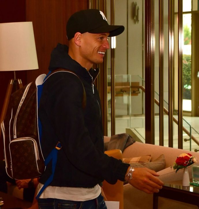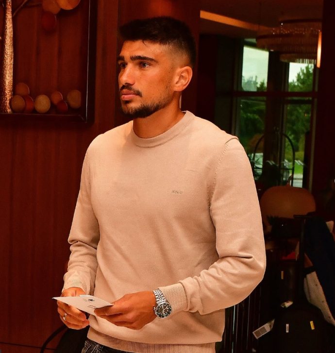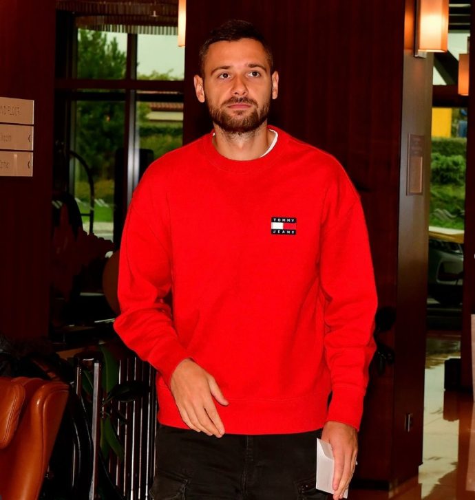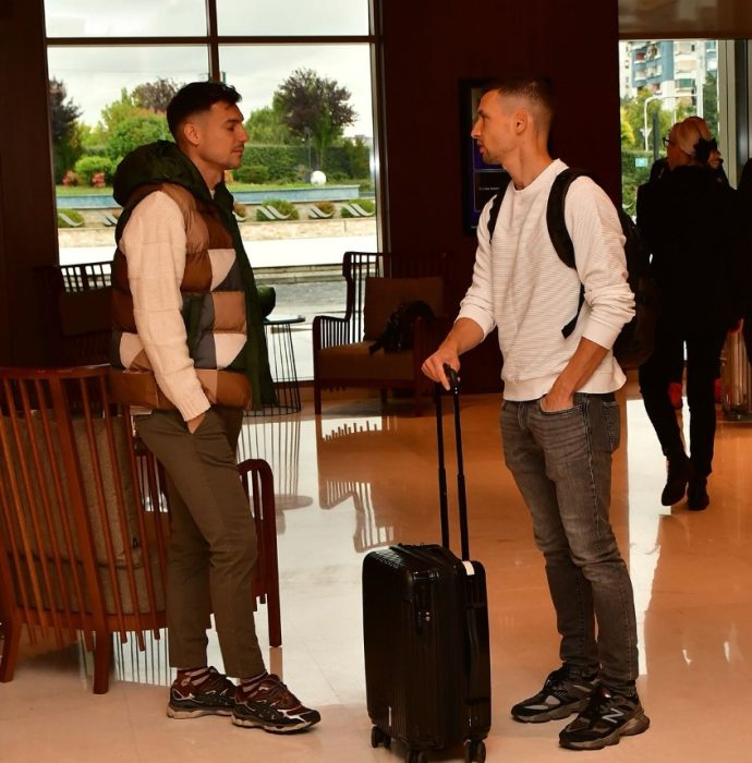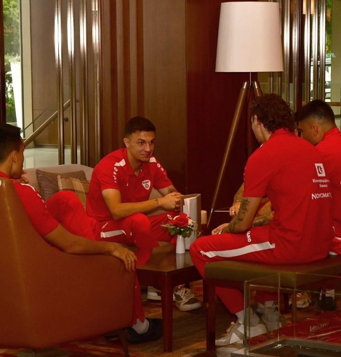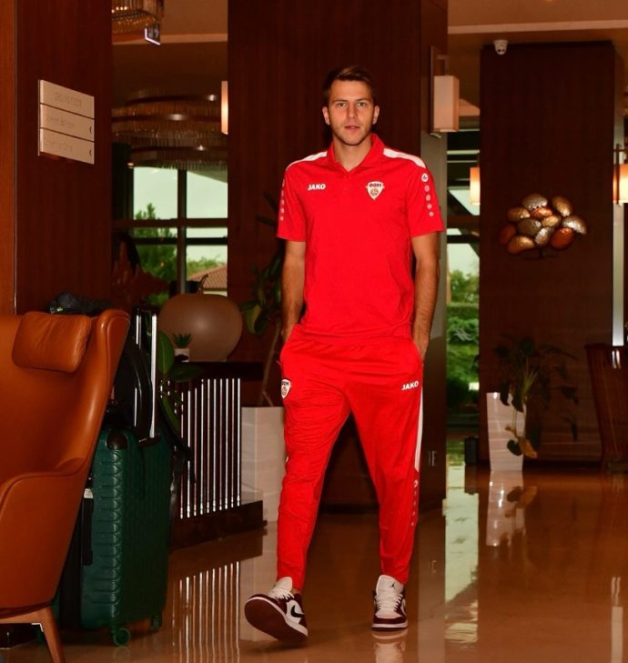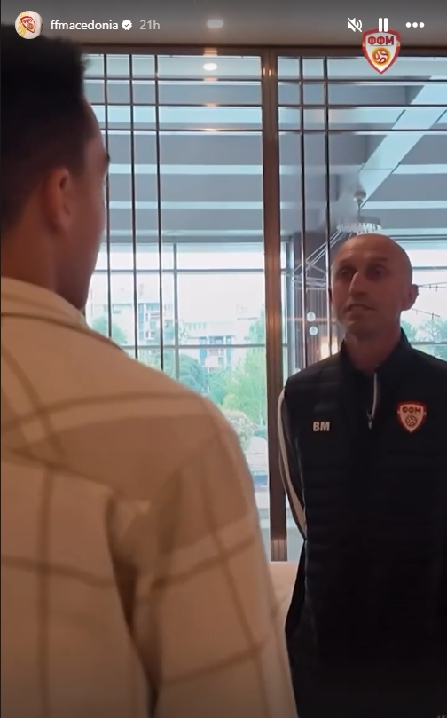 Јани Атанасов небаре игра за а Вардар во црно-црвен дуксер, широки панталони и патики… Кежуал, комфорен, речиси како за на терен.